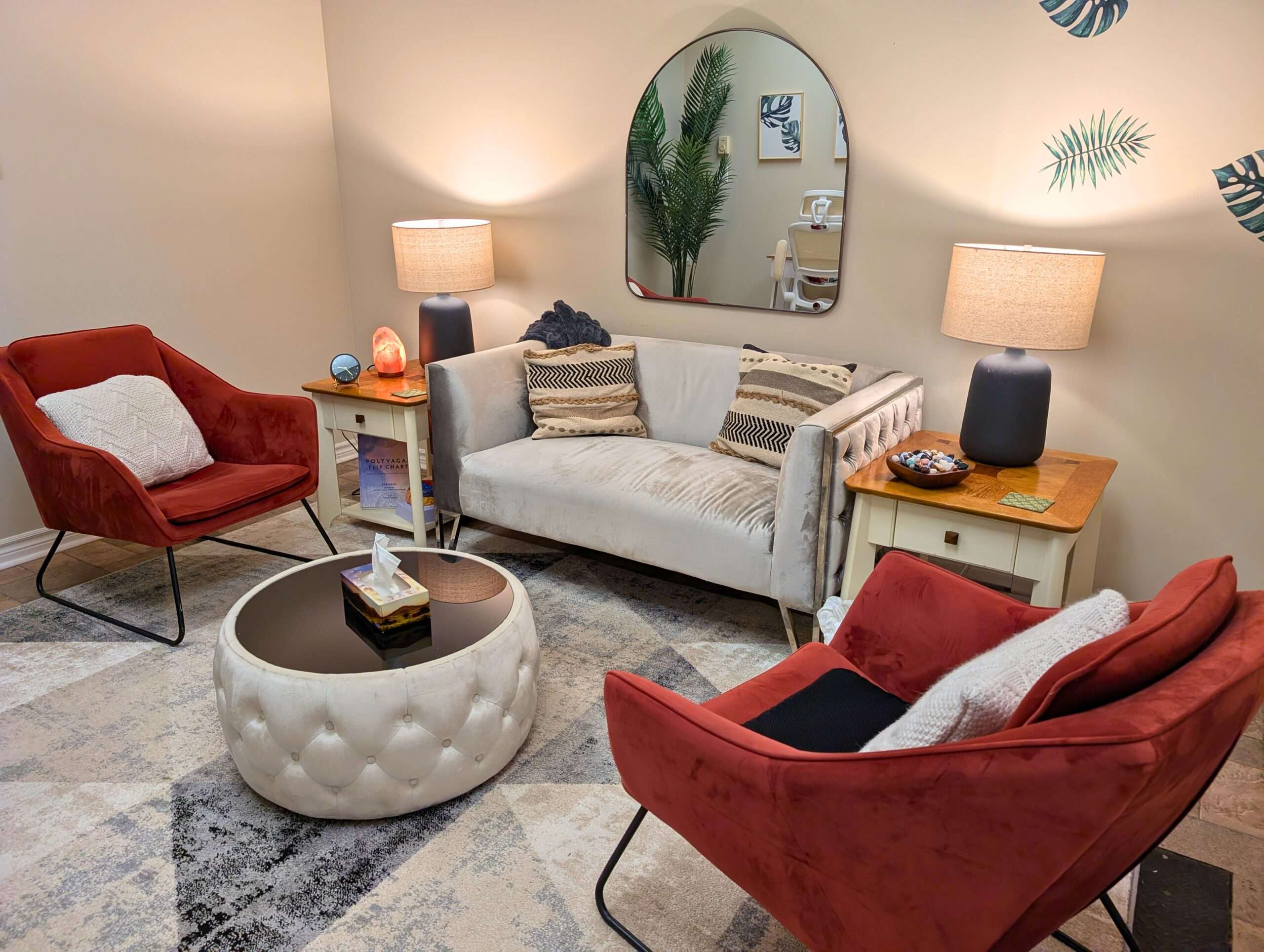 The clinic includes two private therapy rooms, a comfortable reception area, and a client washroom. Our therapy rooms are spacious and thoughtfully arranged to support individual therapy, couples counselling, and family sessions, with ample seating to ensure everyone can settle in comfortably.